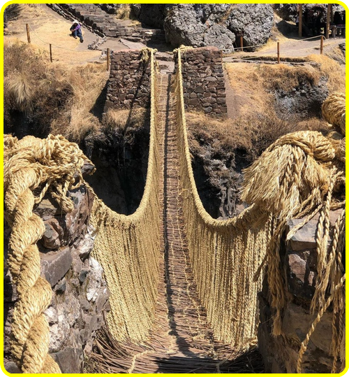 A lo lejos empezamos a escuchar el canto de un río, para cruzar encontramos una inestable pasarela de tablas y un trenzado de cuerdas como barandilla. Este puente se apoyaba sobre dos grandes estribos de piedras con fuertes y sólidos cimientos. En el fondo, a bastantes metros, rugía el río Apurimac. Nunca había visto un puente tan largo, no tendría menos de 200 pasos y el viento lo movía con fuerza. El puente atravesaba un precipicio de vértigo, que había construido, a lo largo de milenios, el río que ahora rugía en el fondo medio oculto por la vegetación. Una confusión de rocas rompían el río en mil pedazos, transformando el color verde, al blanco de la espuma.